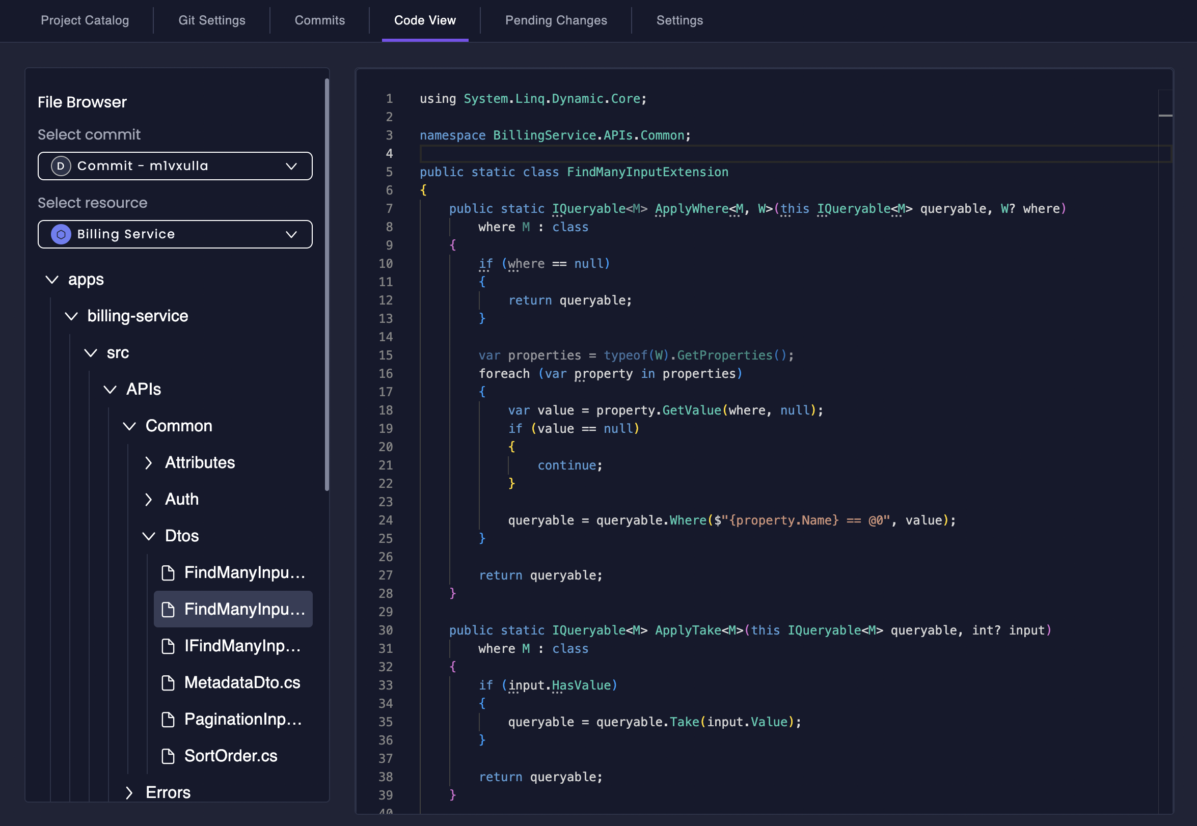 The Code View tab will display a read-only editor with the complete generated codebase for your service. You can browse files, examine code structure, and verify implementation details.