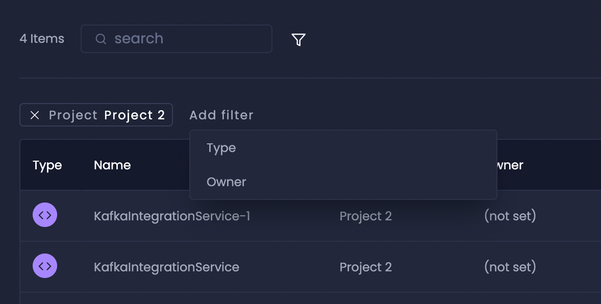 The project column helps you identify which project each service belongs to within your organization. This is particularly useful in the workspace catalog view where you’re managing services across multiple projects. It helps maintain clear organizational boundaries and simplifies resource management across your enterprise.