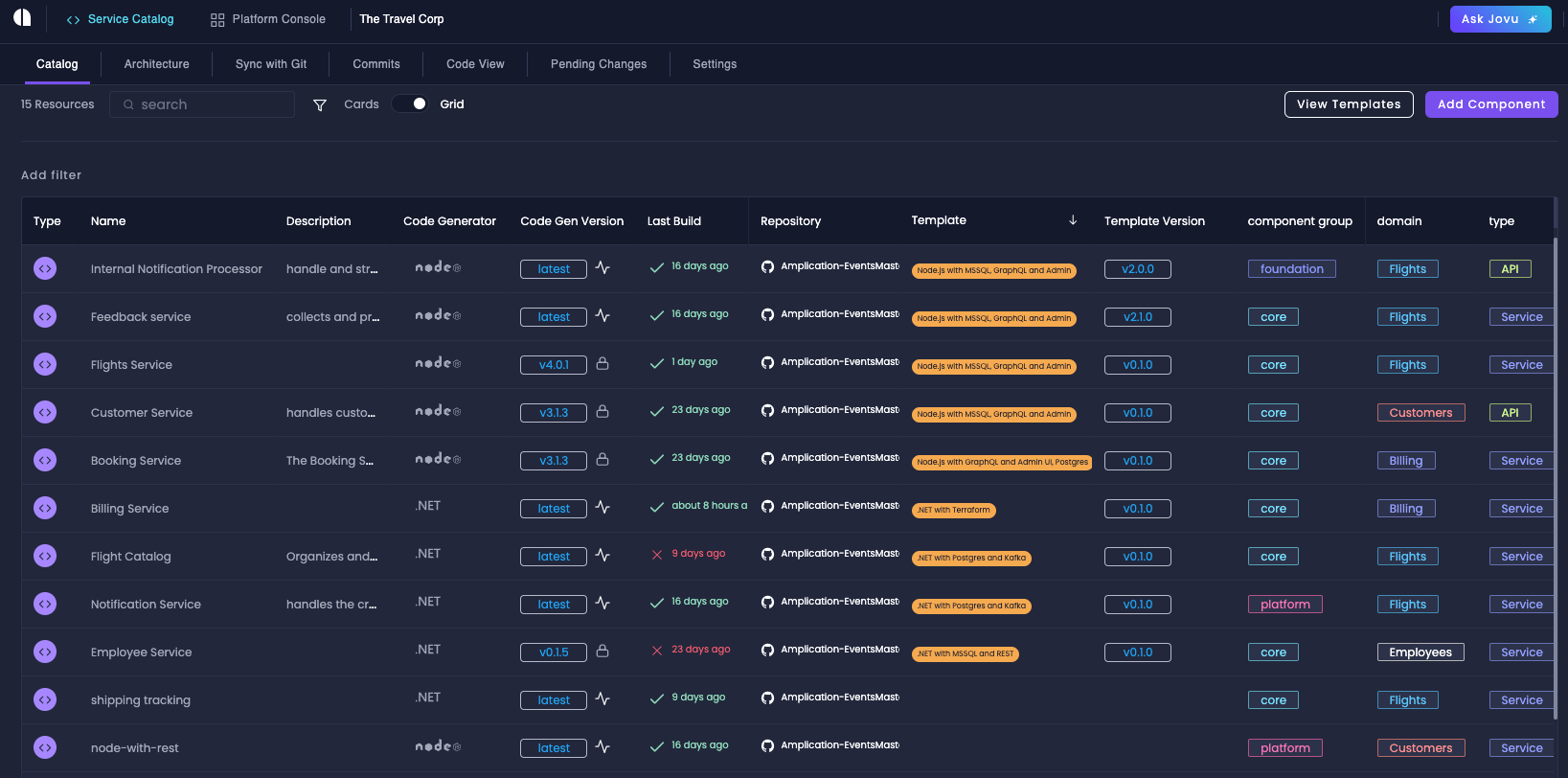 The Software Catalog provides a centralized view of your entire service ecosystem through a powerful and customizable grid interface. This gives you comprehensive visibility and control over all your resources.Complete Service Overview