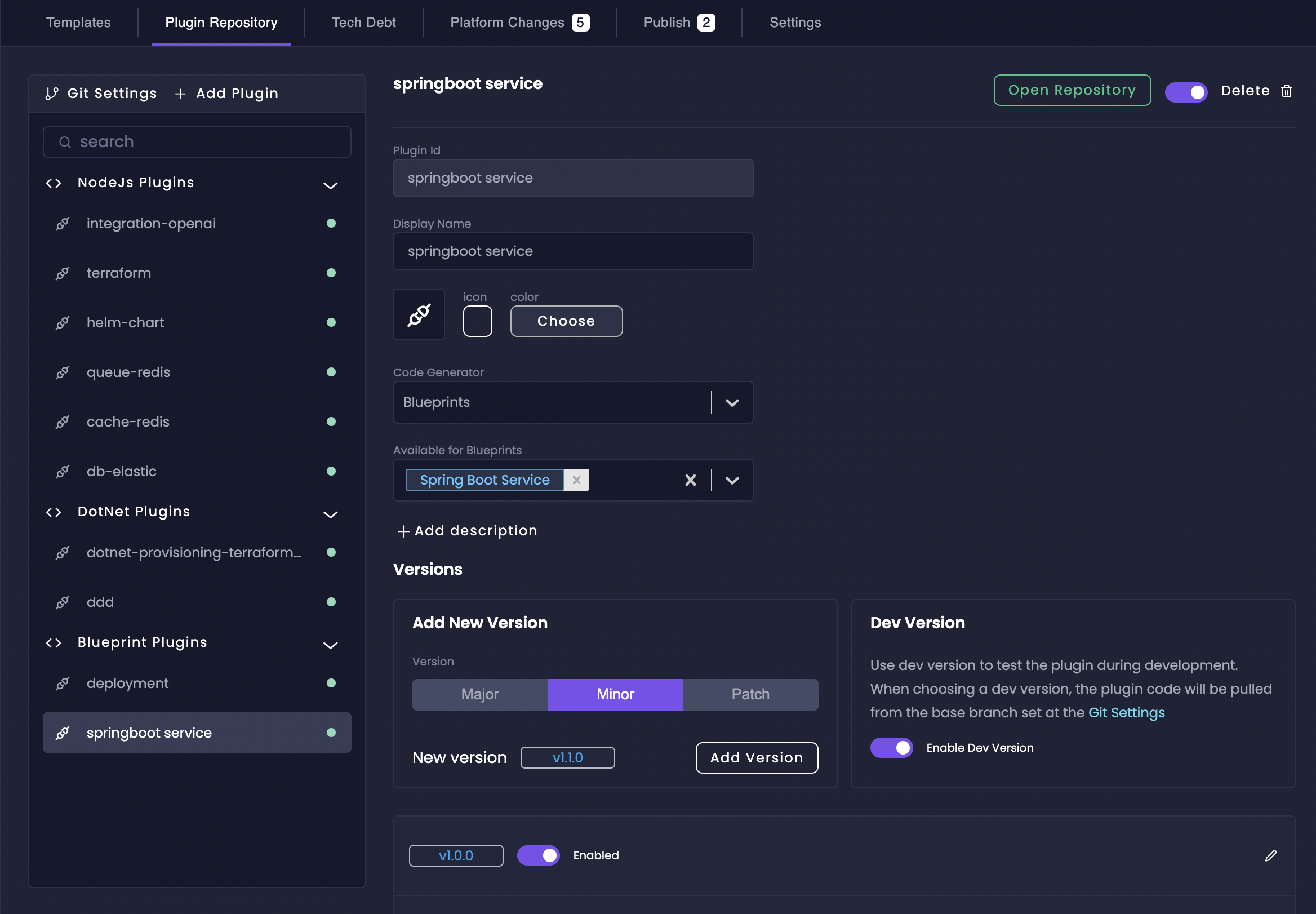 One of the biggest headaches for platform teams is managing technical debt across repositories, especially when managing multiple resources that share common plugins. Plugins, paired with Amplication’s blueprint-driven code generation, help teams stay in sync through automated coordination. Plugins support versioning, allowing the platform team to:- Release and maintain multiple versions of the same plugin