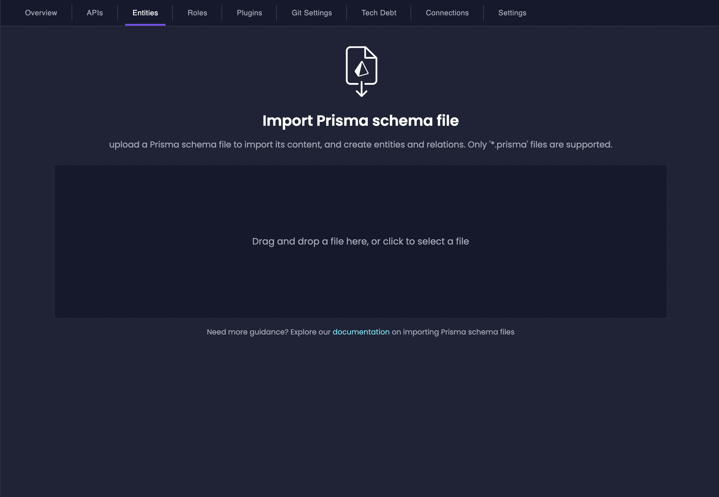 When you upload a Prisma schema, Amplication inspects your existing database structure and generates corresponding entities, fields, and relationships. By standardizing and automating the process, Amplication helps you maintain consistency and best practices across your organization, saving significant time and reducing technical debt.Run the Introspection Process