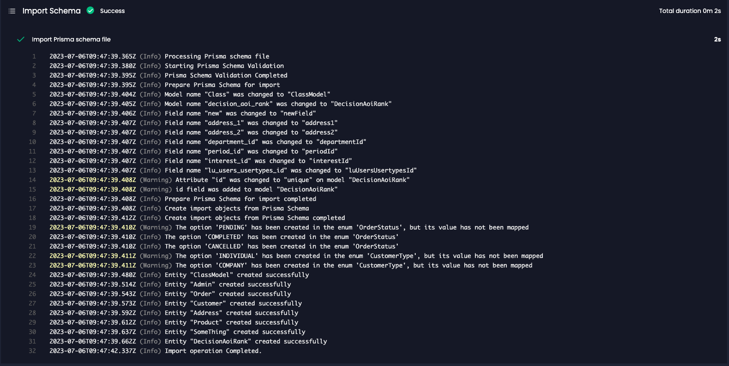 During schema processing, Amplication provides logs, including(Info) and (Warning) messages. While the schema will still process with warnings, it’s crucial to review them. Warnings indicate potential discrepancies or areas where the conversion might not perfectly align with your original schema’s intent. Addressing warnings proactively can prevent unexpected behavior in your generated services.