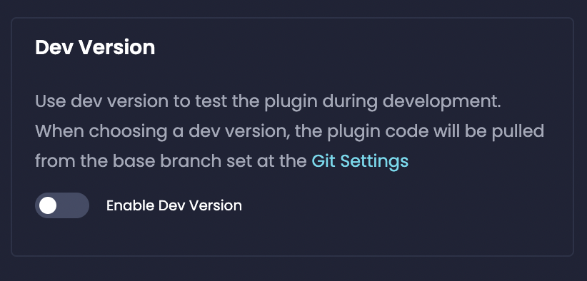 To absolutely make sure you are publishing a stable version of your plugin, you can optionally disable Dev Versions, so that resources can’t select the @dev version. This ensures that you are publishing a stable version based on a specific point in your codebase, not the potentially changing code in your development branch.Navigate to Private Plugins