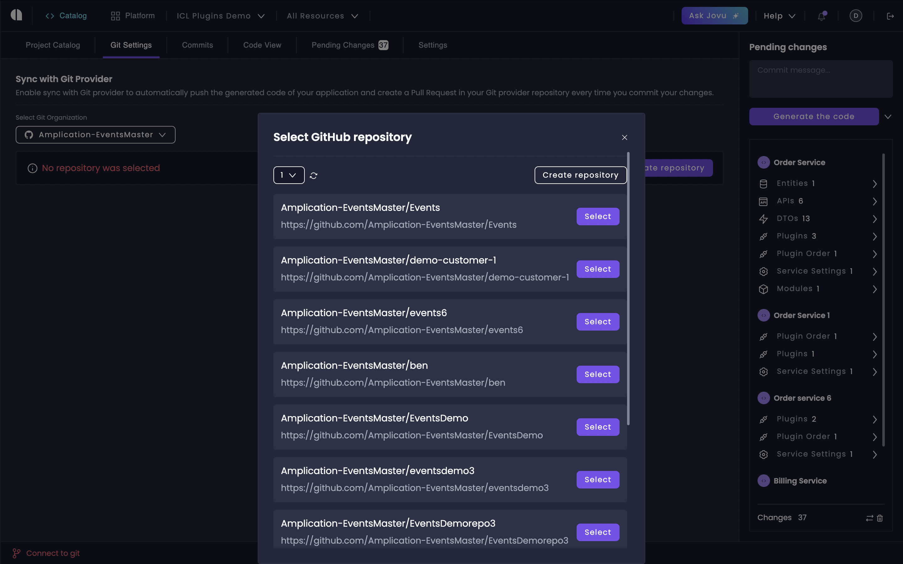 After clicking “Change Repository”, select “Select Git Organization” to choose a new GitHub organization for your repository.
